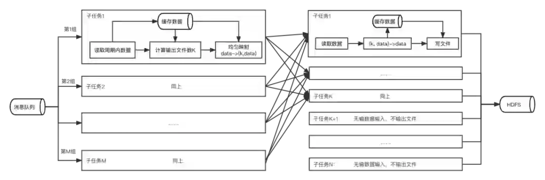 计算本批次产生的目标文件数 K:缓存的数据大小乘以 M 得到本批次所有数据输出大小 total_size,计算当前批次目标文件数 K=total_size/S。