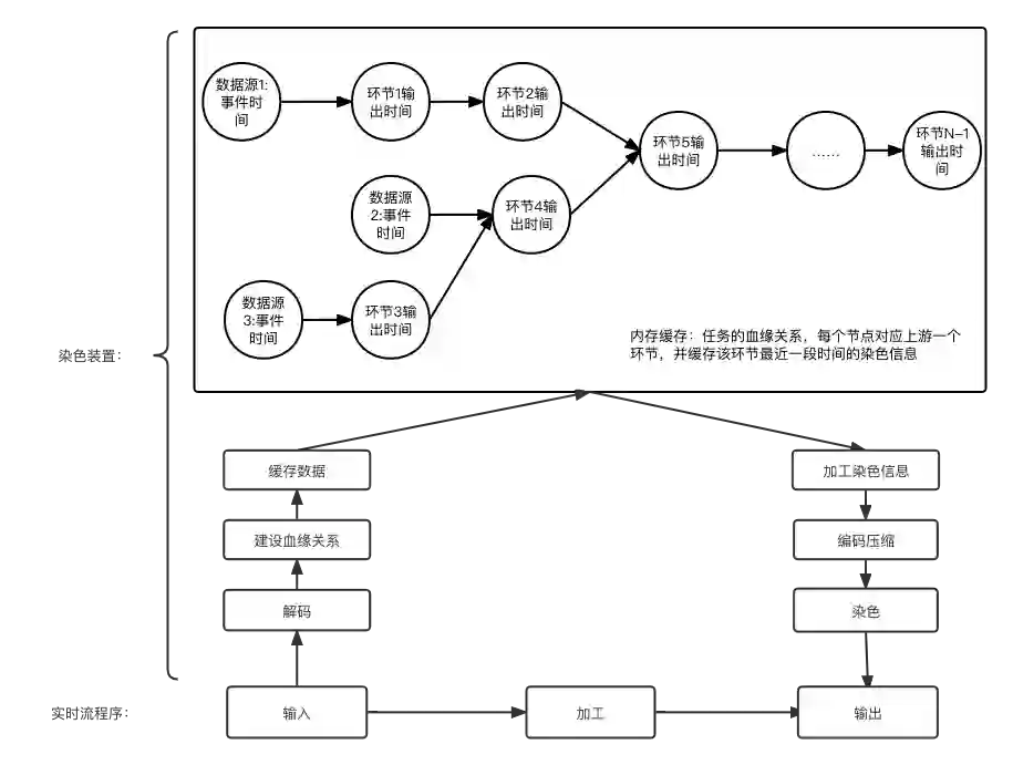 数据染色:如图 3-15 所示,本模块集成到各个加工程序中,将本环节和上游各个环节的时效性信息染色到输出数据中,如事件时间、输出时间等。