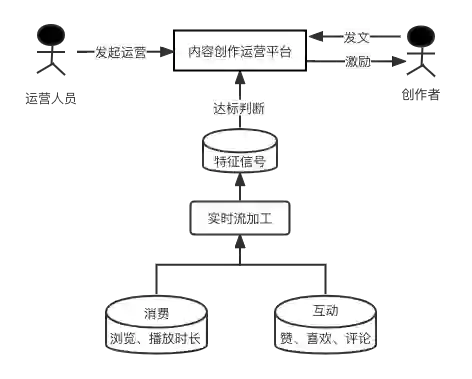 如上图所示,运营人员发起运营活动后,创作者领取相应运营任务,并进行发文。基于实时计算的消费量、互动量等特征信号,可以进行活动达标判断,进而将激励实时触达给创作者,提升运营活动效率。