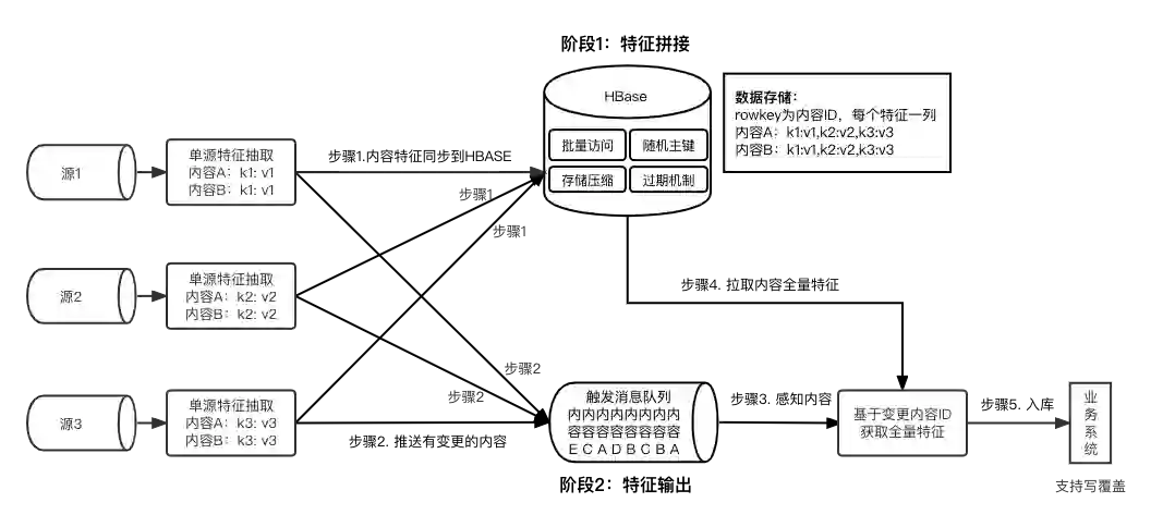 阶段 2:特征输出,通过一个程序统一加工处理,可将每个内容的全量特征输出到目标业务系统中。