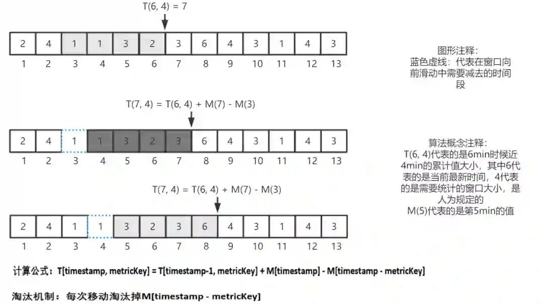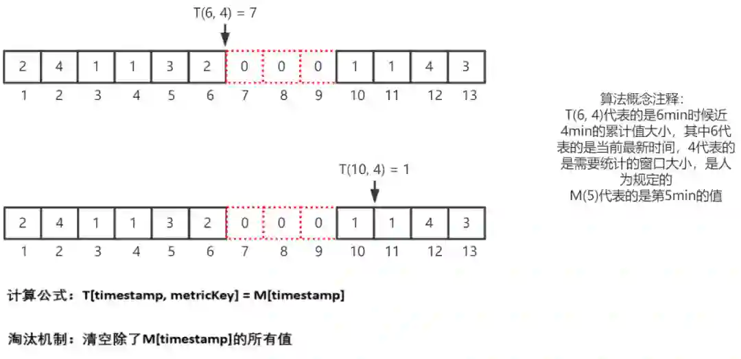 其中,T(6, 4) 代表的是 6min 时候近 4min 的累计值大小,其中 6 代表的是当前最新时间,4 代表的是需要统计的窗口大小,是人为规定的。M(5) 代表的是第 5min 的值。
