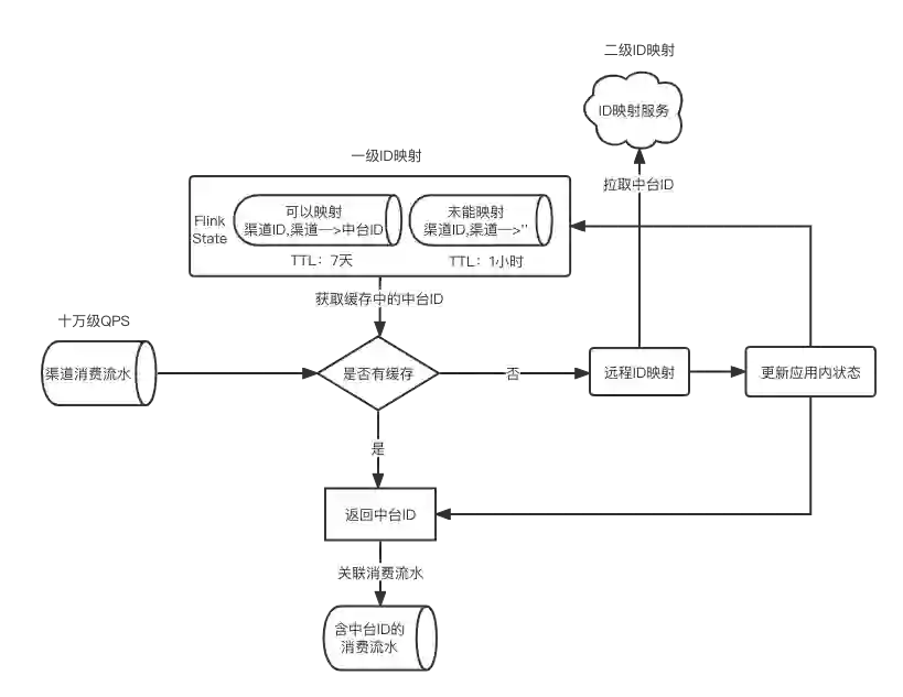 一级缓存:在程序中构建 Flink 应用内状态(Flink State),缓存渠道 ID 到中台 ID 的映射。因为远程拉取中台 ID 时有缺失,缺失时无法判断是当时映射服务有遗漏但是后续请求能映射上,还是该渠道 ID 本身无法映射到中台 ID,为保障数据准确性,我们构建了 2 种 State 控制 ID 映射: