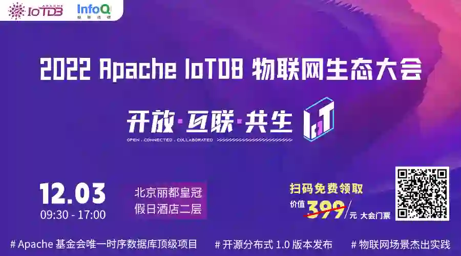 想探究如何更好的设计物联网场景数据管理架构?想了解 Apache 基金会唯一时序数据库 top-level 项目 Apache IoTDB 提供的物联网数据管理方案?期待、好奇 Apache IoTDB 最新 1.0 版本 (分布式)?想知道 Apache IoTDB 在各领域龙头企业的实践案例和合作生态?12 月 3 日,在北京丽都皇冠假日酒店举行的 [2022 Apache IoTDB 物联网生态大会] 将解答你的所有问题!扫描下方二维码,免费领取价值 399 元的大会门票!