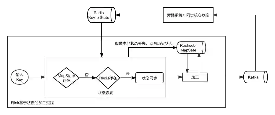 Flink 应用内状态恢复模块:为访问 State 的前置逻辑,如果 Key 在应用内状态中丢失,则从远程 Redis 中恢复。