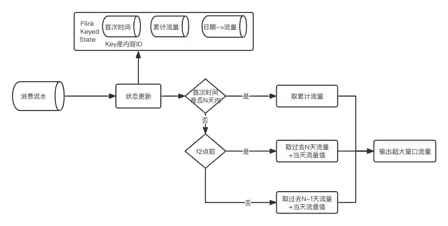如上图所示,计算单个内容 ID 的超大滑动窗口指标过程如下。