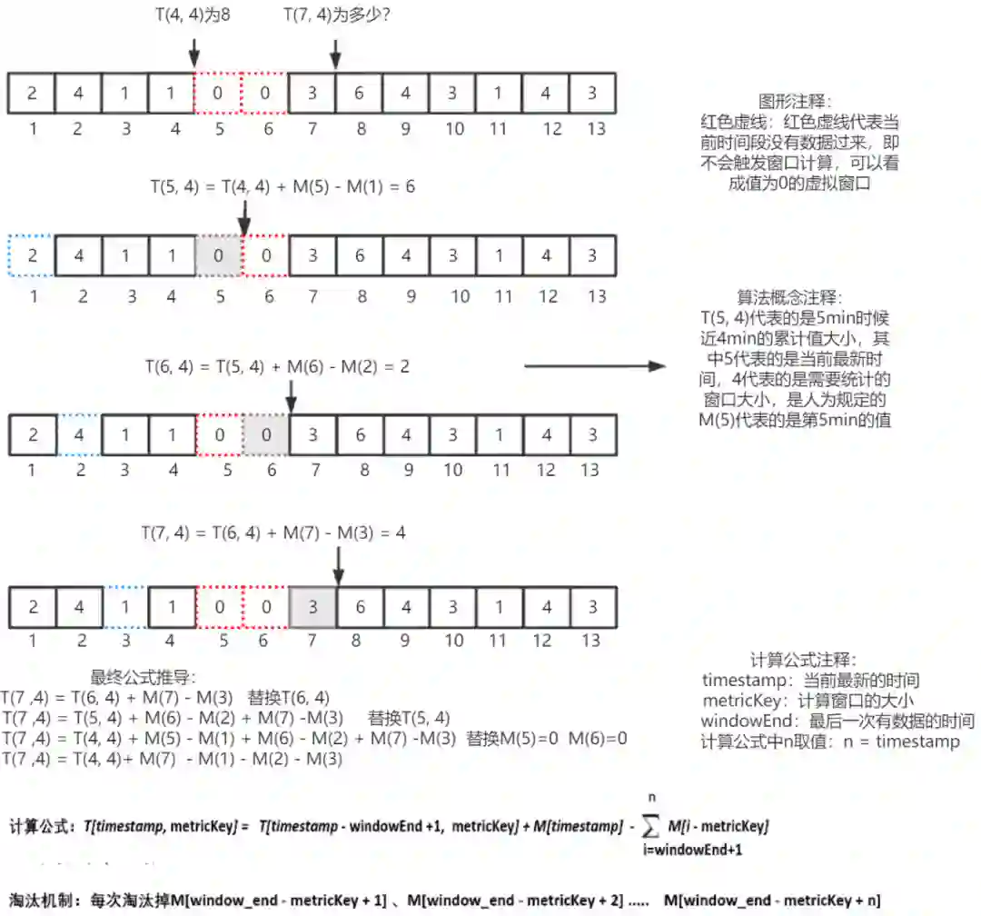 其中,T(5, 4) 代表的是 5min 时候近 4min 的累计值大小,其中 5 代表的是当前最新时间,4 代表的是需要统计的窗口大小,是人为规定的,M(5) 代表的是第 5min 的值。
