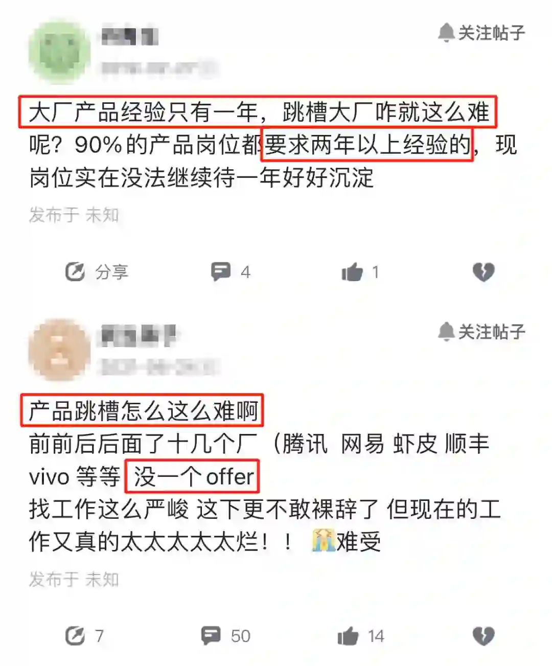 脉脉上想年后跳槽的产品人,也都在诉苦: