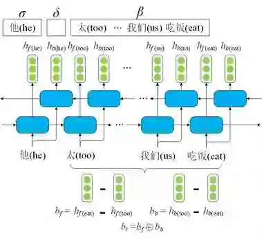 例如图5中计算缓存的表示时,先用“吃饭”的正向LSTM表示减去“太”的正向LSTM表示,获得该段正向的表示,再用“太”的反向LSTM表示减去“吃饭”的反向LSTM表示,获得该段反向的表示。二者拼接起来作为此时缓存的表示。