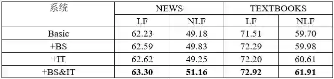我们的系统在中英文数据集上都获得了很好的实验结果,表1是SemEval-2016 Task 9中文数据集上的实验结果。该数据集分为两部分,分别是新闻集(NEWS)和小学课本集(TEXTBOOKS),前者句子较长、较复杂,后者句子较短、较简单。该评测的评价指标中最重要的两个分别是弧标签的F值(LF)和有多父节点的词的弧标签的F值(NLF)。