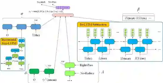 为了更好地获得转移状态的表示,我们在上述结构的基础上提出了2个有效的神经网络模块——Bi-LSTM Subtraction和Incremental Tree-LSTM,分别对转移过程中的缓存和子图进行建模。图4给出了该模型的整体结构图。