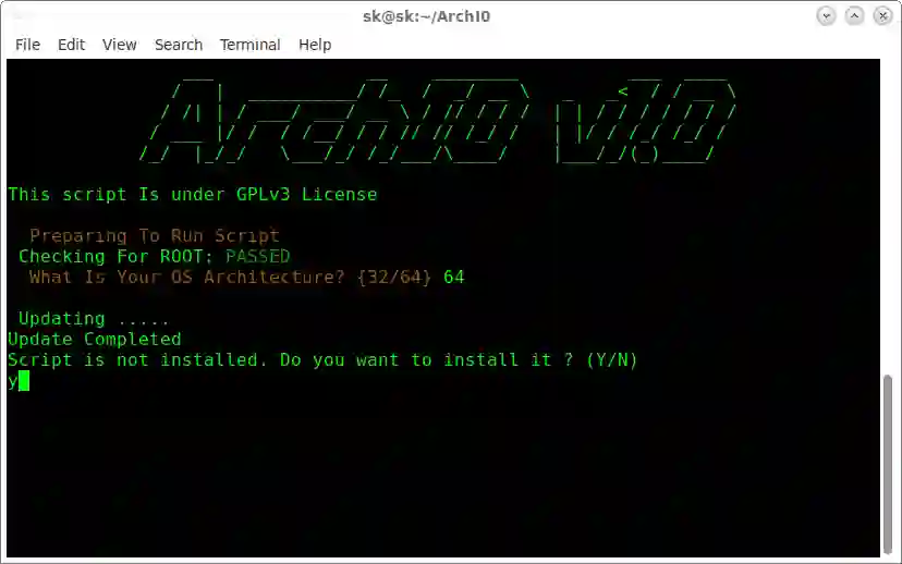输入你的 Arch Linux 系统架构然后按回车键。当其请求安装此脚本时,键入 y 然后按回车键。