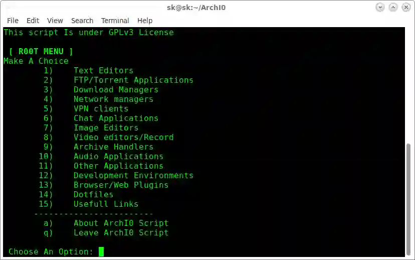 正如前面的截图, ArchI0 包含有 13 类、90 个容易安装的程序。这 90 个程序刚好足够配置一个完整的 Arch Linux 桌面,可执行日常活动。键入 a 可查看关于此脚本的信息,键入 q 可退出此脚本。