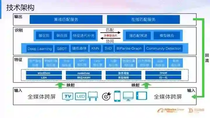 大家可以看到,整个技术体系都是,先把数据接进来,再通过一些机器学习或者深度学习的办法(像word2vec,node2vec,TFIDF,归一化等)处理特征层,之后映射到一些比较抽象的高纬度Level(比方说像用户的身份信息,网络的环境相似度,文本的相似度,APP相似度等等)。