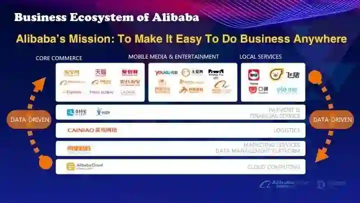 这是阿里的一个生态体系图。最底层是阿里巴巴的阿里云,这是我们的一个计算存储框架。上面是阿里妈妈,阿里妈妈是负责整个阿里巴巴计算广告的一个部门,再上面是菜鸟、支付宝和蚂蚁金服。然后是与商业相关的,像淘宝网、天猫、聚划算等等,或者是跟文娱相关的,优酷土豆,还有像阿里旅行,口碑之类的业态。