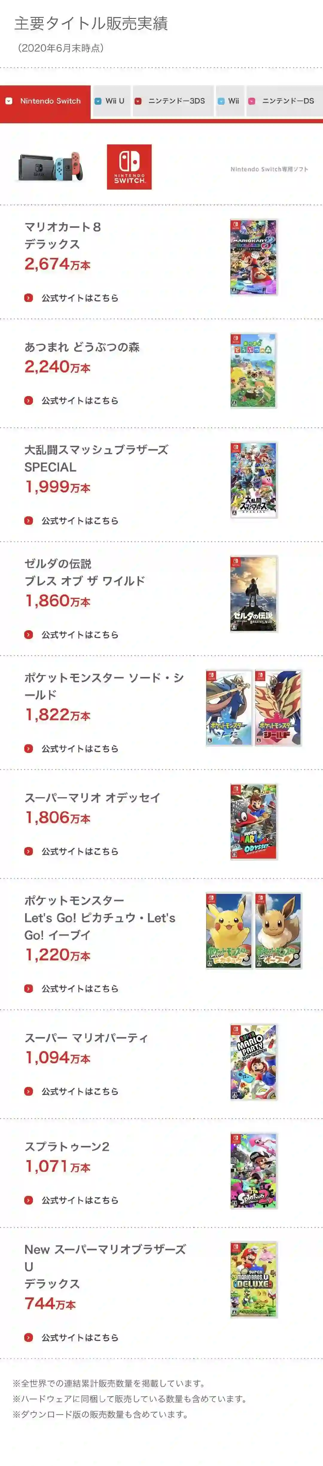 该平台上体感游戏的战况如何呢?根据任天堂官网公布的信息,截至2020年6月,Switch平台的游戏销量榜单前十全是传统游戏类型,大火的健身环却只有400多万的销量。