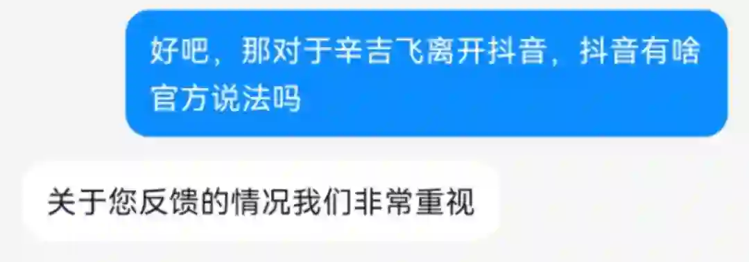 对于辛吉飞退出抖音,我们联系了抖音APP在线客服,对方并没有选择正面回答此问题,一直在翻来覆去表达“关于您反馈的情况我们非常重视”的说法。