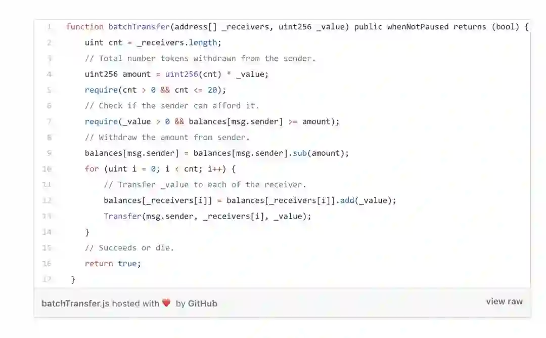 美链这个安全漏洞其实非常简单!美链智能合约中一个batchTransfer函数, 主要目的是实现BEC token的批量转账: 将固定整数数量(_value) 转账到一批接收账号的数组里 (_receivers). 为了实现这样的批量转账, BEC的开发人员, 首先计算需要转账的总金额, 计算的公式是: