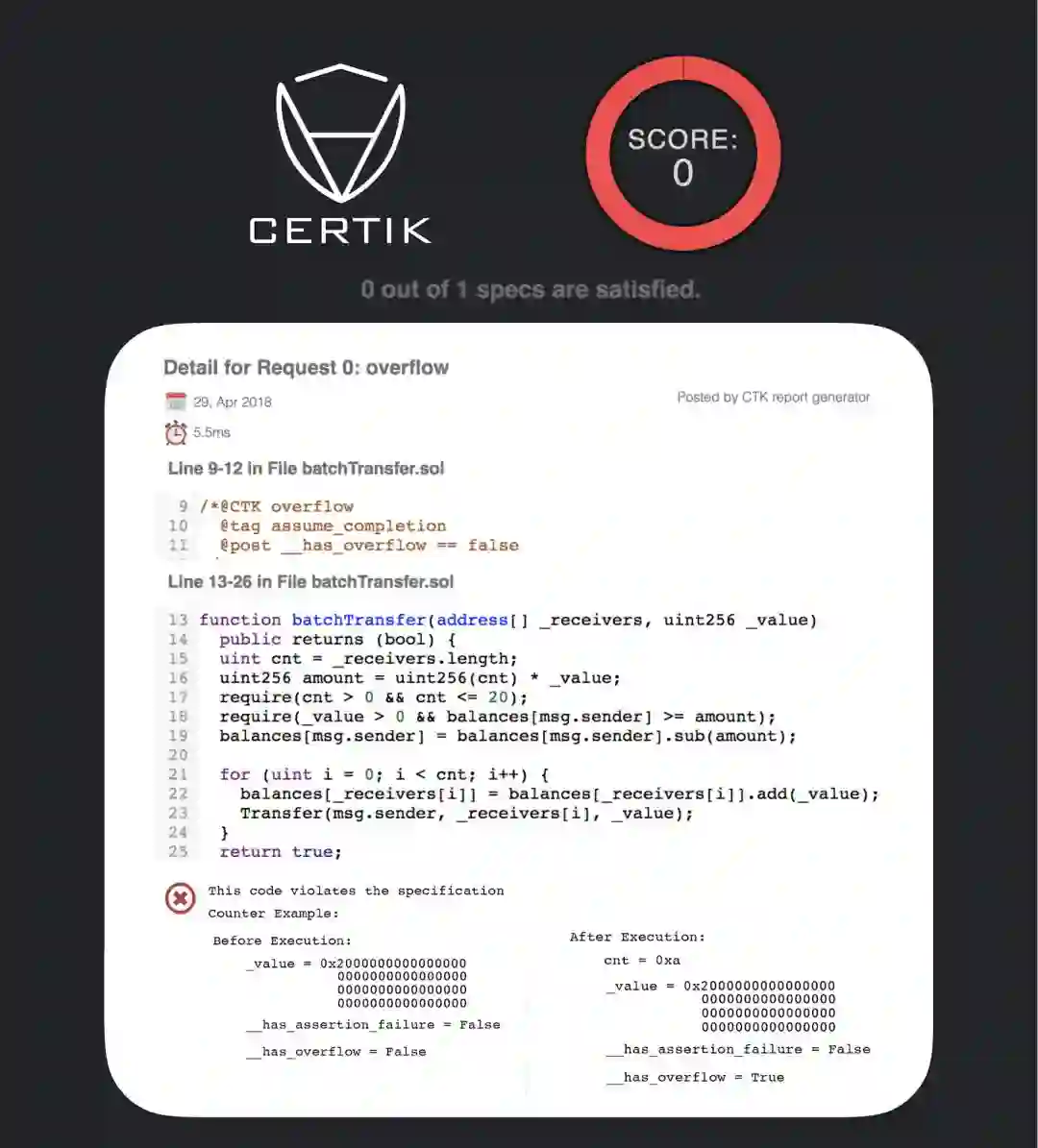 CertiK 的验证引擎能够轻易的检测到BEC的溢出错误
