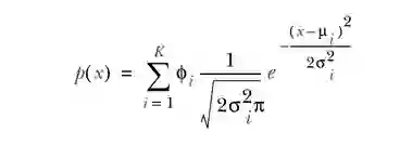 该公式和之前的公式非常相似,细节上有几点差异。首先分布概率是K个高斯分布的和,每个高斯分布有属于自己的μ和σ参数,以及对应的权重参数,权重值必须为正数,所有权重的和必须等于1,以确保公式给出数值是合理的概率密度值。换句话说如果我们把该公式对应的输入空间合并起来,结果将等于1。