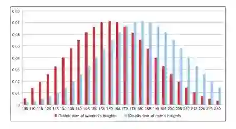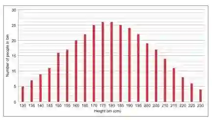 如果我们对大量的人口进行身高数据的随机采样,并且将采得的身高数据画成柱状图,将会得到如下图1所示的图形。这张图模拟展示了334个成人的统计数据,可以看出图中最多出现的身高在180cm左右2.5cm的区间里。