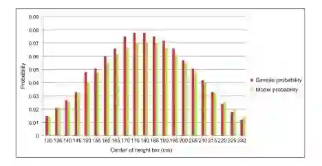 回到之前的例子来评估下参数和对应的实际数据。假设我们用柱状线来表示分布概率,每个柱状线指相应身高值在334个人中的分布概率,用每个身高值对应的人数除以总数(334)就可以得到对应概率值,图2用左侧的红色线(Sample Probability)来表示。