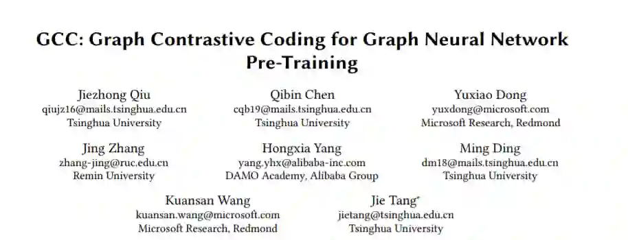 图表示学习已经成为解决现实问题的一种强大的技术。节点分类、相似度搜索、图分类和链接预测等各种下游图学习任务都受益于它的最新发展。然而,现有的图表示学习技术侧重于特定领域的问题,并为每个图训练专用的模型,这些模型通常不能转移到域外数据。受最近自然语言处理和计算机视觉的预训练进展的启发,我们设计了图对比编码(GCC)——一种无监督图表示学习框架——来捕获跨多个网络的通用网络拓扑属性。我们将GCC的预训练任务设计为网络中或跨网络的子图级实例识别,并利用对比学习来授权模型学习内在的和可转移的结构表示。我们对三个图学习任务和十个图数据集进行了广泛的实验。结果表明,在一组不同的数据集上进行预训练的GCC可以取得与任务相关的从零开始训练的GCC具有竞争力或更好的性能。这表明,预训练和微调范式为图表示学习提供了巨大的潜力。