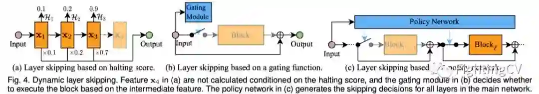 由于其即插即用特性,gating函数也是动态层跳过的常用选项。以ResNet为例(见上图(b)),让表示第个残差块的输入特征,gating函数生成一个二进制值以决定残差块的执行。这个过程可以用下式表示: