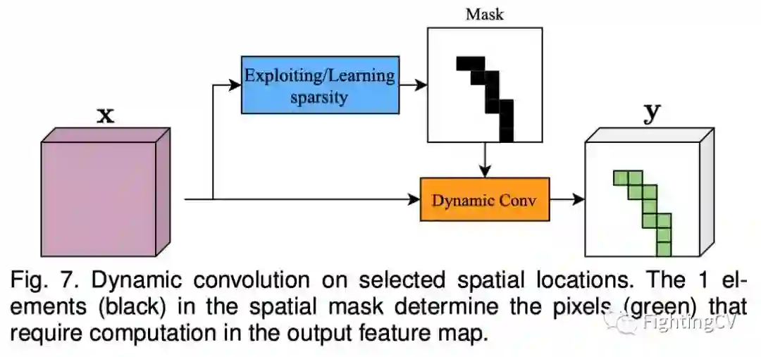 动态稀疏卷积。为了减少信息量较小位置上的不必要计算,只能对策略采样的像素执行卷积。现有的采样策略包括1)利用输入的固有稀疏性;2) 预测零元素在输出上的位置;和3)估计像素的显著性。典型的方法是使用额外的分支生成空间掩码,确定每个像素上卷积的执行(如上图所示)。