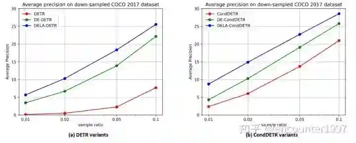 尽管以上实验说明了我们的方法能够在数据量有限的情况下显著提升模型性能,它并不能表明我们的方法在数据量充足时依然有效。为此,我们在数据量充足的COCO2017上测试我们方法的性能。有趣的是,我们的方法不仅不会降低模型在COCO 2017上的性能,还能带来不小的提升。具体来说,DELA-DETR和DELA-CondDETR分别相较于它们的baseline提升8.1AP和2.8AP。