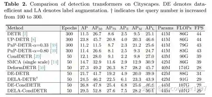 目前的研究似乎表明Detection Transformers能够在性能、简洁性和通用性等方面全面超越基于CNN的目标检测器。但我们研究发现,只有在COCO这样训练数据丰富(约118k训练图像)的数据集上Detection Transformers能够表现出性能上的优越,而当训练数据量较小时,大多数Detection Transformers的性能下降显著。如图1所示,在常用的自动驾驶数据集Cityscapes[8](约3k训练图像)上,尽管Faster RCNN能够稳定的取得优良的性能,大多数Detection Transformers的性能显著下降。并且尽管不同Detection Transformers在COCO数据集上性能差异不到2AP,它们在小数据集Cityscapes上的性能有大于15AP的显著差异。