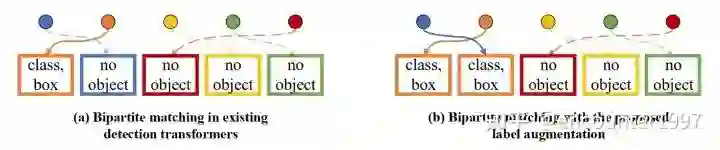 图3:(a)现有Detection Transformer的标签分配方式;(b)使用标签增强后的标签分配。圆圈和矩形框分别表示模型的预测和图片上的物体标注。通过复制橙色方框表示的物体标注,蓝色圆圈表示的模型预测也在标签分配中匹配到了正样本,因此得到了更丰富的监督信号。