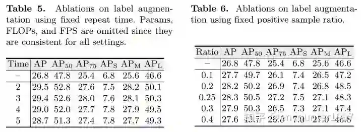 如方法部分中讨论的,我们考虑了两种标签增强策略。包括固定重复次数和固定正负样本比例。在本部分,我们对这两种策略进行消融。如上表中左表所示,使用不同的固定重复倍数均能够提升DE-DETR的性能,但随重复次数增加,性能提升呈下降趋势。我们默认采用重复正样本标签2次。此外,如右表所示,尽管使用不同正负样本比例均能带来性能提升,在正负样本比例为1:3时,其取得的性能最佳,有趣的是,这也是RCNN系列检测器如Faster RCNN中最常用正负样本采样比例。