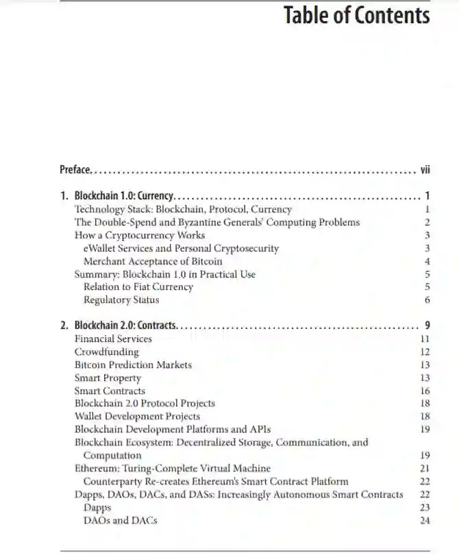● 这本书将带你超越货币(“区块链1.0”)和智能合约(“区块链2.0”),展示区块链如何成为继大型机、pc、互联网和移动/社交网络之后的第五大颠覆性计算范例。