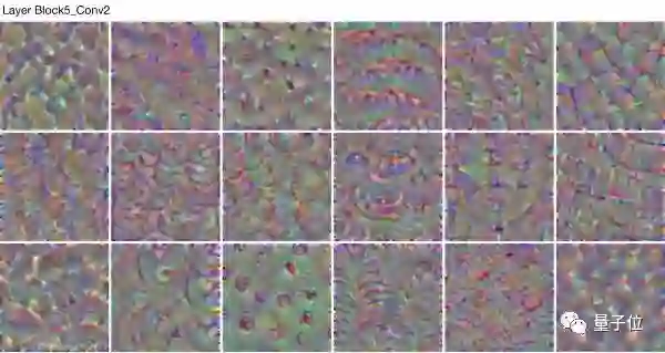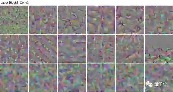 随着VGG16网络模型继续深入,这些颜色和方向与基本的纹理进行组合,逐渐生成特殊纹理。当进入Block3_Conv1后,方向和颜色的表现开始变少,开始出现更加复杂的纹理特征(圆形、螺旋形、多边形、波浪等形状组合),到了Block5_Conv1后可以清晰看到其纹理更加特别,卷积核随着网络空间信息的增长而出现了更加精细和复杂的特征。