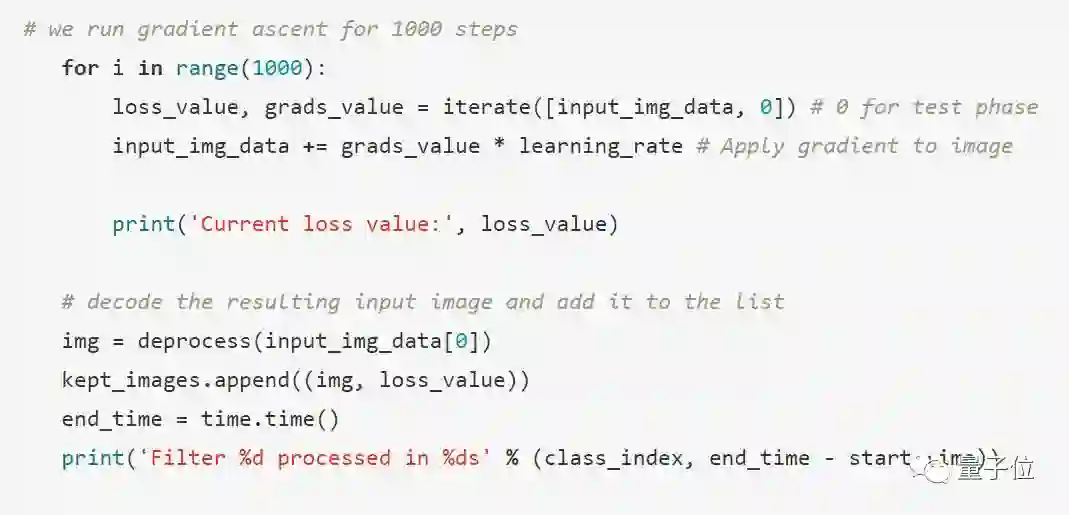 根据刚刚定义的损失函数iterate_fun,现在可以根据梯度上升对卷积核的激活值进行梯度上升计算。