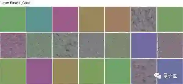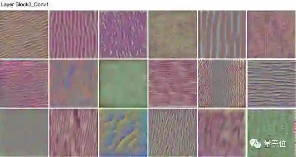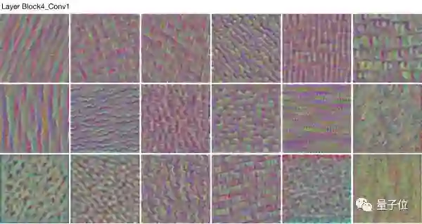 惊讶的是即使对于级别相对高的滤波器,如Block4_Conv1中,通过旋转、平移获得相同的可视化卷积核仍然成立。