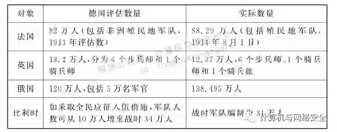 战前,德国重点对对象国的兵力数量进行了评估,在积极搜集情报、综合分析对象国可能采取的措施、扩军政策、社会状况的基础上,对潜在对手的兵力有了准确的认识。从下表可看出,德国对兵力的评估工作相当出色。