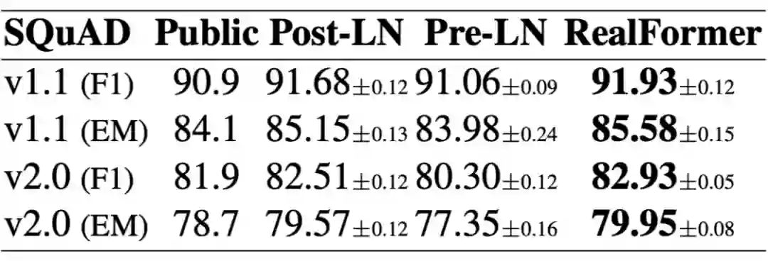 实验结果表明,RealFormer 同时有着 PostLN 和 PreLN 的优点,甚至比两者更好,是一个值得使用的改进点。