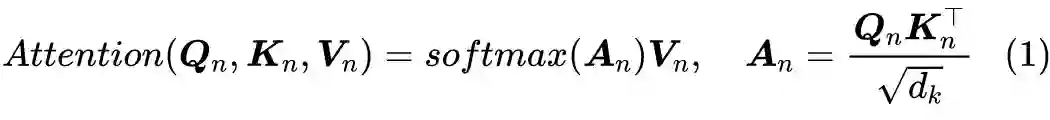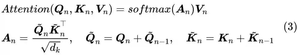 说回模型,如上图所示,RealFormer 主要是把残差放到了 Attention 矩阵上面了,而整体依然保持了 PostLN 的结构,因此既保持了 PostLN 的性能,又融合了残差的友好。具体来说,就是原来第 n 层的 Attention 为: