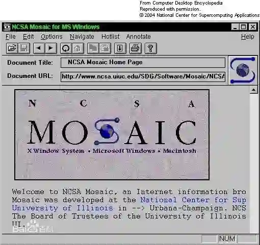 1993年初,世界上第一个可以显示图片的浏览器Mosaic-Alpha版(运行于Unix平台)发布,9月份Mosaic-1.0版(运行于Apple Macintosh、Microsoft Windows平台)发布。Mosaic的界面简洁,网页展示区域很宽,为Web的超文本语言增添了全新的特点,不但可以显示图像,还能循环展示GIF动图,用户不用特别掌握电脑方面的专业知识,也不用经过任何特殊训练,用小小的鼠标就可以方便地浏览Web网的内容。原来仅在技术专家之间进行的网络通信一下变成了寻常百姓都能理解的有趣事情。