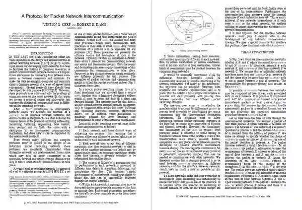 瑟夫和卡恩为开发这种通信协议绞尽脑汁。1974年5月,瑟夫和卡恩在IEEE期刊上发表了题为《关于分组交换的网络通信协议(A Protocol for Packet Network Intercommunication)》的论文,提出了用传输控制协议TCP(Transmission Control Protocol)和网际互连协议IP(Internet Protocol)来实现计算机网络之间的互连。