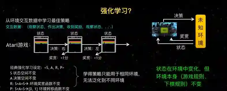 事实上这可能是一个误解,现在虽然已经有很多强化学习的研究,包括用强化学习来打游戏,在很多游戏上获得胜利等等,看起来是和环境交互,但事实上,在整个强化学习的经典假定里面,它所考虑的是状态在环境中的变化,但是环境本身的基本规则比如下围棋的游戏规则,在游戏过程中是不变的。