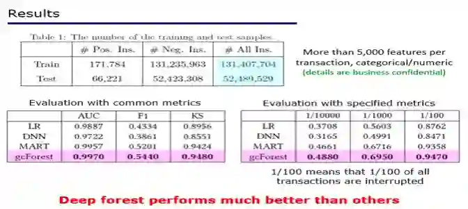 我们给大家看个结果,训练数据用了1亿3千多万的真实交易,测试数据用了5千多万真实交易,这可能是世界上最大的关于互联网交易非法套现的数据。这家公司内部有一个大型分布式机器学习系统,他们的工程师很厉害,做了深度森林的大规模分布式实现,实测结果来看比系统中以往的模型包括深度神经网络在内的性能都还要更好一些。这也验证了我们所猜想的,在很多其它任务上,图像、视频、语音之外的任务上,非神经网络模型能找到用武之地。
