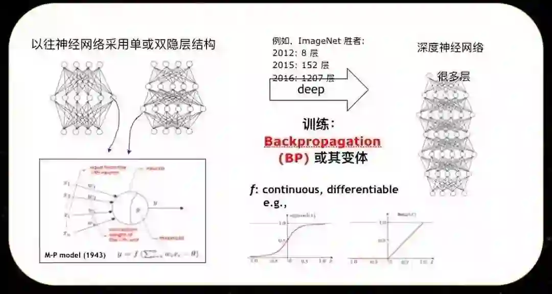 实际上,这样的模型当中有大量参数需要计算,所以需要非常复杂、非常庞大的计算系统。虽然现在我们有了很强的计算设备和很巧妙的算法,但是我们能够做到这一切,根本的原因之一是神经网络中基本计算单元激活函数是连续可微的。原来浅层神经网络用的是左边的函数,也是连续可微的,深度学习的年代我们通常会用右边这样的函数或变体。