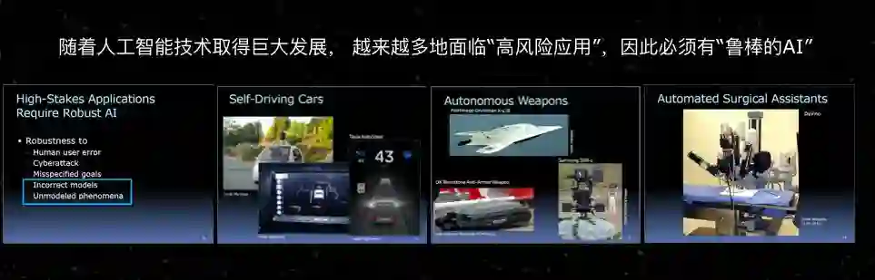所谓高风险应用是指自动驾驶汽车、自主武器、远程辅助外科手术等等,这一类应用无一例外都是一旦出现了问题,会造成巨大的损失。所以,我们才希望不要出问题,希望学习过程必须有鲁棒性。