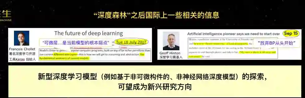 后来国际上关于这件事情也有一些反响和探讨。Keras的创始人说,这种可微层是当前深度学习模型的根本弱点,现在我们的模型本身是不使用可微层的;深度学习的奠基人Geoffrey Hinton说放弃BP从头开始,现在我们的模型就完全没有使用BP算法。这类模型不一定仅限于“深度森林”这样的模型,基于非可微构件、非神经网络的深度模型可能是下一步很值得探讨的方向。大家知道深度神经网络已经研究了二十多年,再往下研究的空间可能不见得那么大,但是其它的模型有没有可能做深呢?一旦我们往前走了一步,可能会给我们带来巨大的空间。