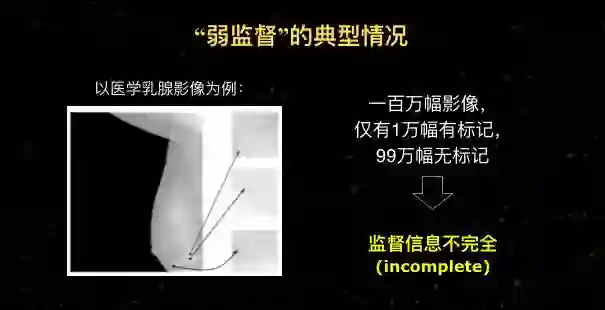所谓的弱监督学习,就是希望监督信息不用那么多了,稍微少一点,它还是能够工作得很好。举几个典型的弱监督学习的例子:在医院里诊断乳腺图像的影像,希望看到影像中有没有钙化点。一个医院有很多数据,比如100万幅图像,但是医生只标注了一万幅,有99万幅没有标记,这种叫做监督信息不完全。