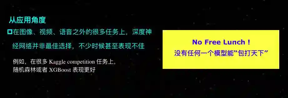 周志华教授说,机器学习界早就很清楚,“没有免费的午餐”,也即任何一个模型可能只适用于一部分的任务,而另外一些任务是不适用的。例如,Kaggle竞赛中有各种各样的任务,但在图像、视频、语音之外的很多任务上,比如订机票、订旅馆之类,还是传统机器学习技术(如随机森林或XGBoost)表现更好,尤其是涉及符号建模、离散建模、混合建模等问题。