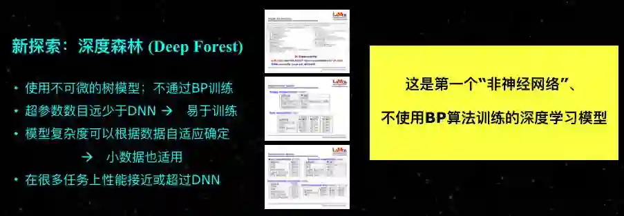 最近我们的课题组做了一些研究,提出了一个新的模型叫做“深度森林”,这是不基于神经网络来做的模型,它的基本构件是决策树,本身是不可微的,所以不能用BP训练,模型复杂度可以自己根据数据调整,超参数比深度神经网络要小。除了大规模的图像类任务之外,很多的任务上它的性能已经达到或者接近了深度神经网络的性能。从学术上来说,特别值得关注的就是它是第一个非神经网络,不使用BP算法训练的深度学习模型。